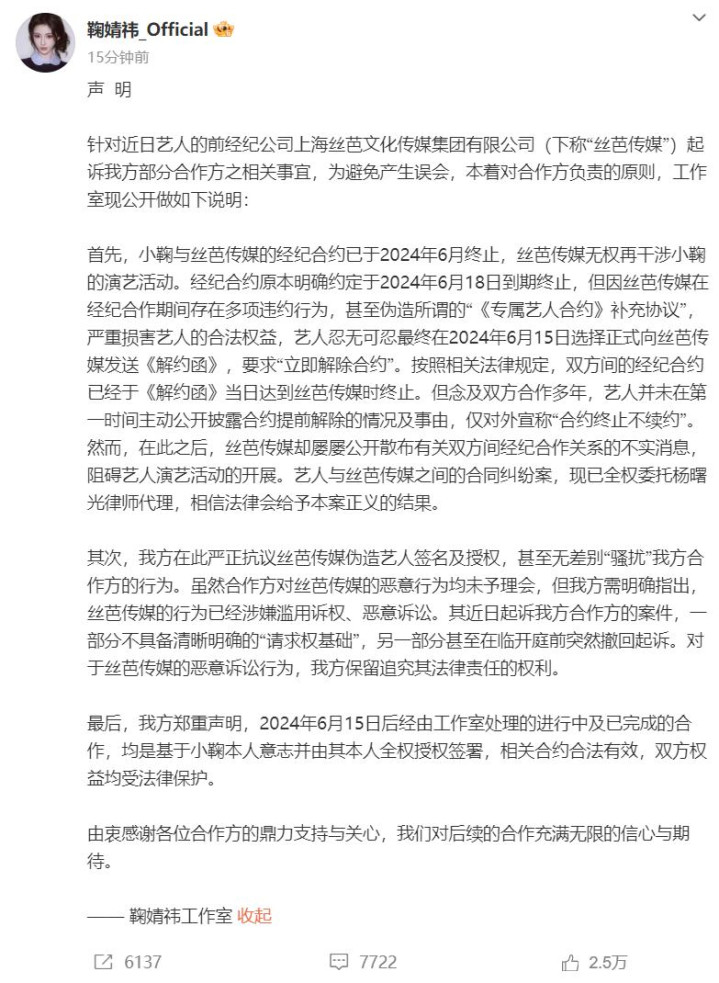 鞠婧祎方发声明, 称与丝芭传媒的经纪合约已于2024年6月终止, 同时指控丝芭伪造艺人签名及授权, 甚至无差别“骚扰”合作方
